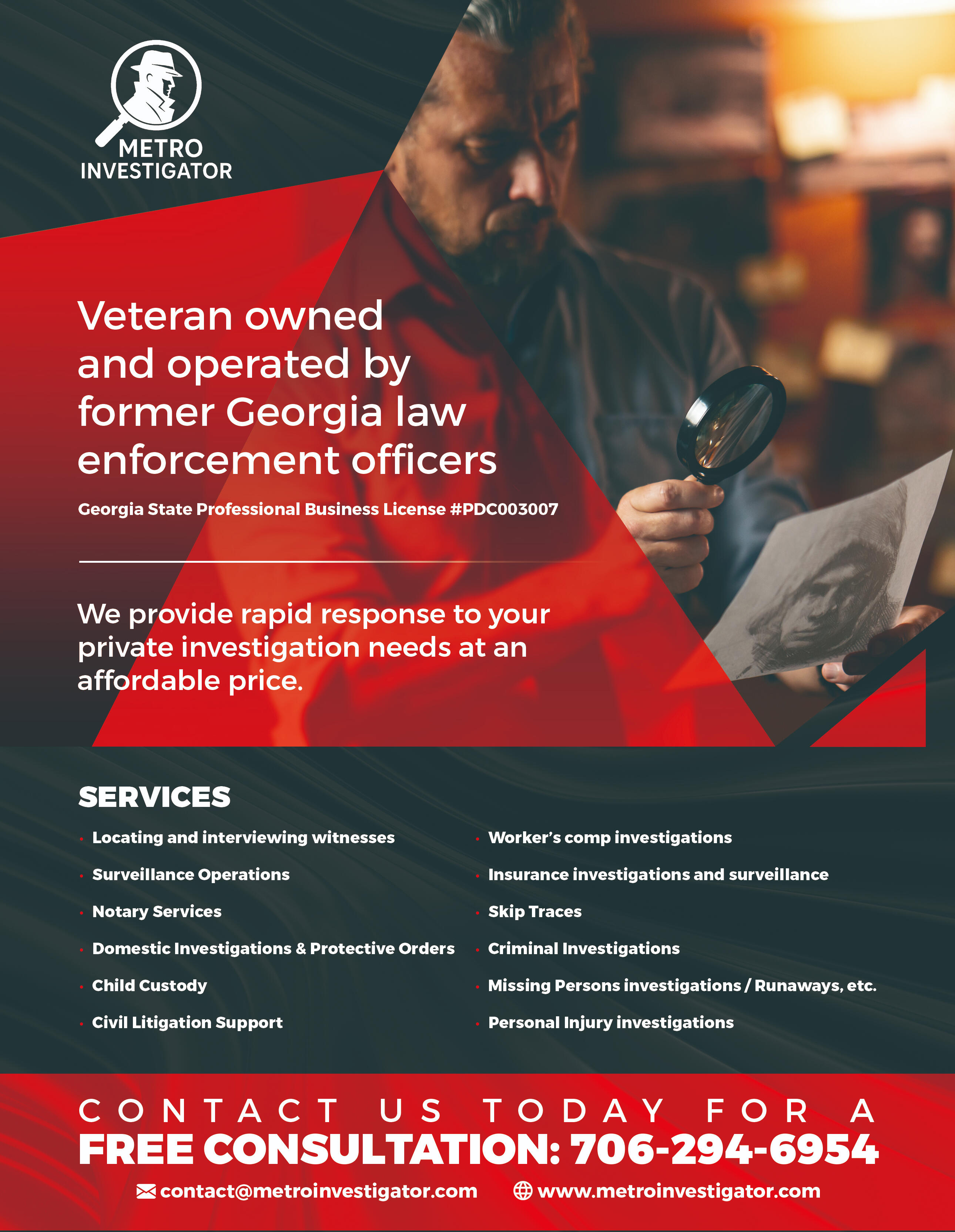 Atlanta #1 private investigator company. Metro Investigations LLC. Licensed, bonded, insured, and ready to serve. Veteran owned and operated by former law enforcement officers. We do it all. Call us today for a free quote 706-294-6954